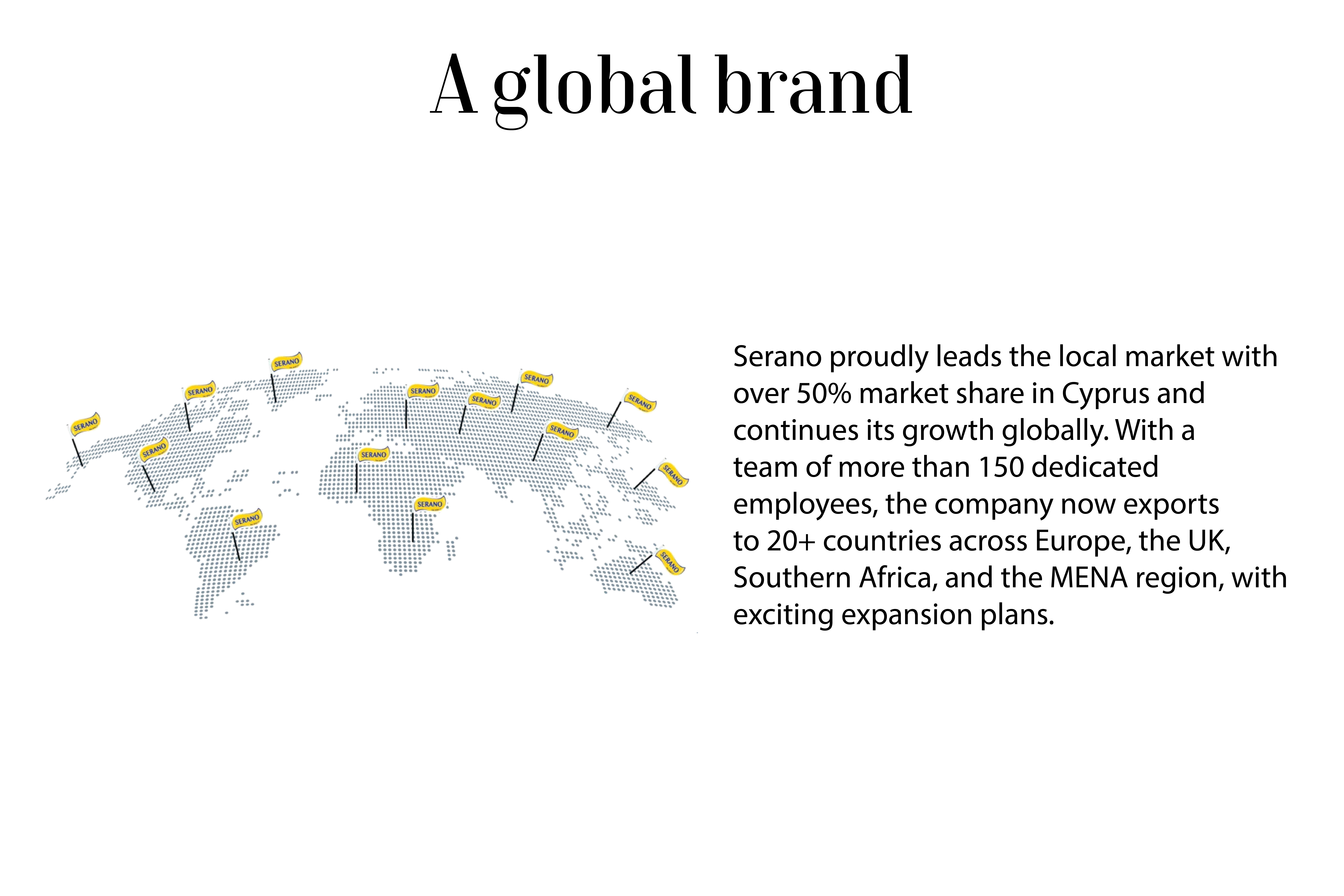 Serano proudly leads the local market with over 50% market share in Cyprus and continues its growth globally. With a team of more than 150 dedicated employees, the company now exports to 20+ countries across Europe, the UK, Southern Africa, and the MENA region, with exciting expansion plans.